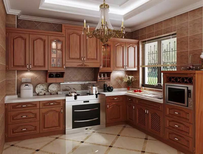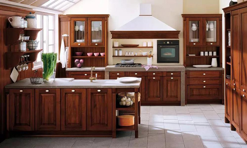 使用實木制作櫥柜門板,風格多為古典型,美式、中式家居風格中比較常見,以櫻桃木色、胡桃木色、橡木色為主。