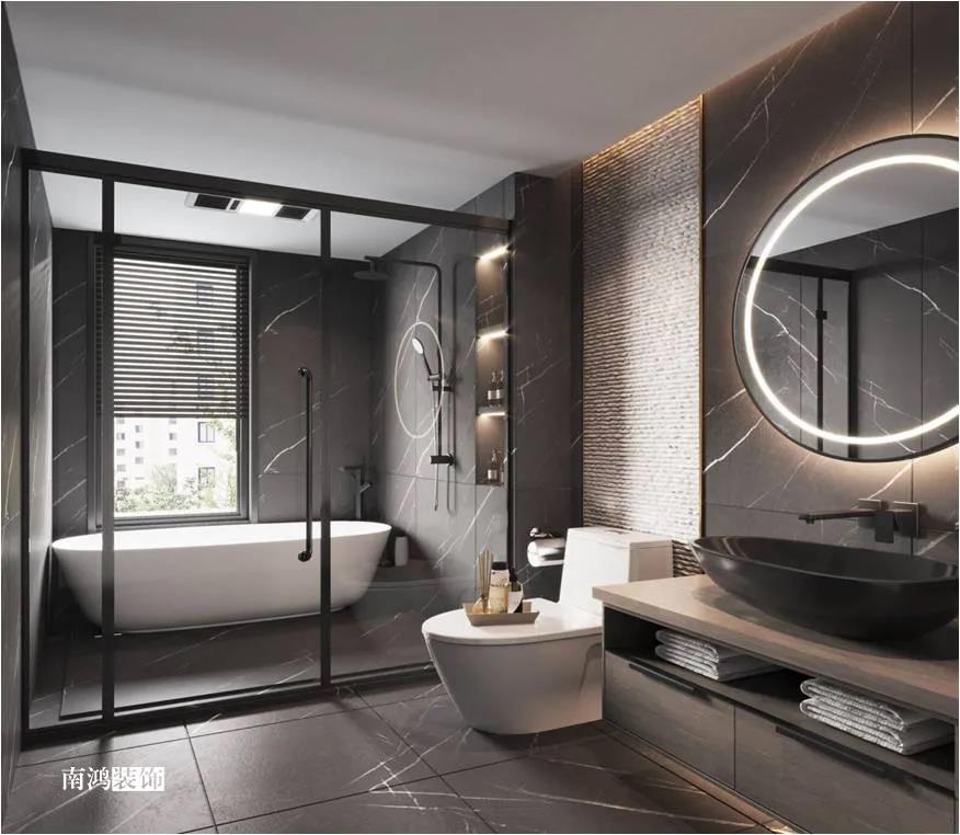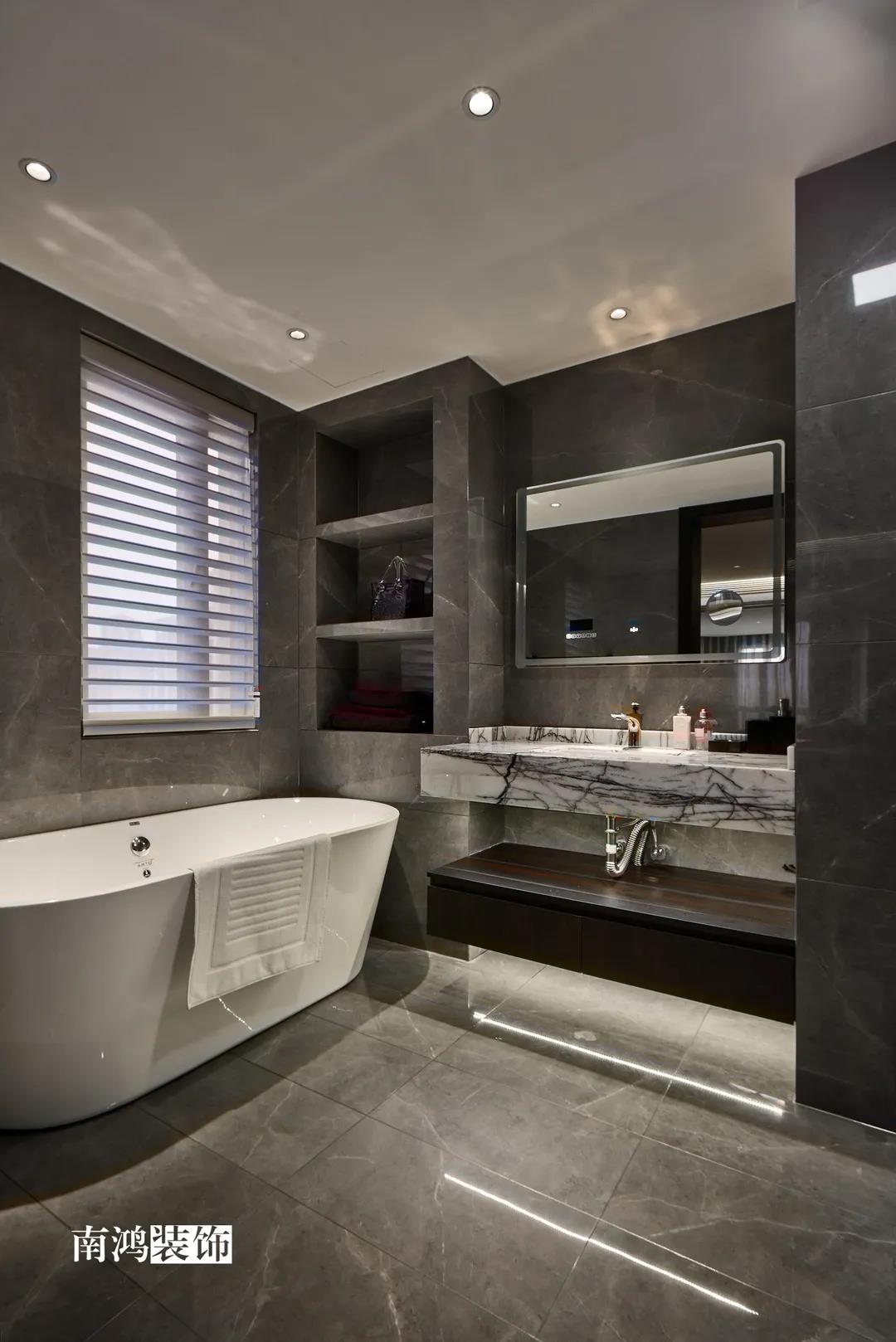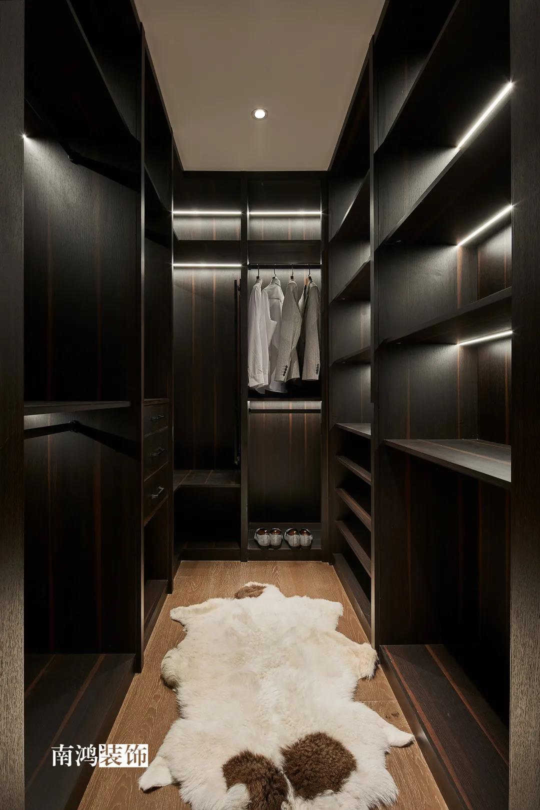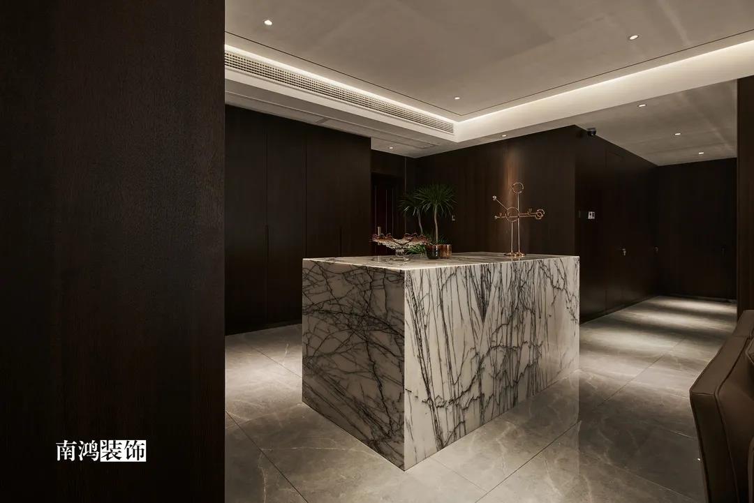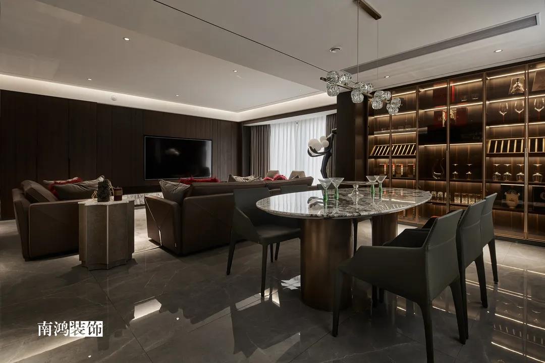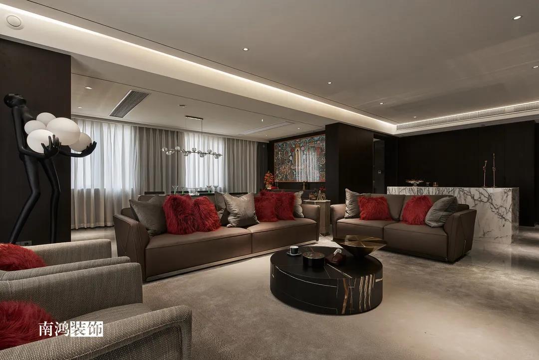 色彩上主要依照男主人的喜好,選擇了深色的石材與木飾面,點綴上深紅色的軟裝元素,整體搭配不會太過沉悶,再結合柔和的燈光用以打造空間氛圍感,完美詮釋“紅與黑”主題!