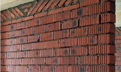 新砌墻體頂部九五磚雙向斜切磚縫抹灰均勻(嚴禁多孔磚側(cè)向砌筑)